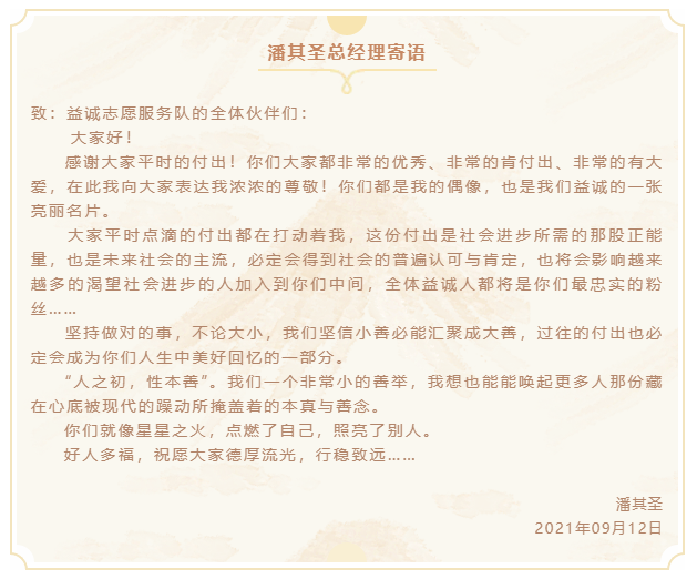 本次团建活动结束后,潘其圣总经理特寄语全体志愿者伙伴,勉励大家德厚流光,行稳致远: